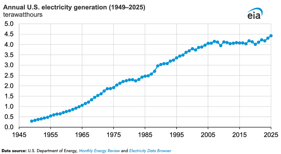 The numbers are in. Last year, the United States generated 4,430 terawatt-hours of electricity. That’s up 2.8% from 2024, which previously had been the highest annual total in the Energy Information Administration’s record books, which date back to 1949. Residential electricity sales grew 2.2%, while commercial surged by 2.9% and industrial rose by just 0.7%.