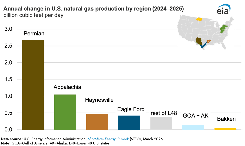 Natural gas production, meanwhile, hit a record in 2025, growing by 5.3 billion cubic feet per day, according to the latest analysis from the Energy Information Administration. Three regions — Appalachia, the Permian, and Haynesville in Louisiana — accounted for 67% of the total production increase and 81% of the growth.