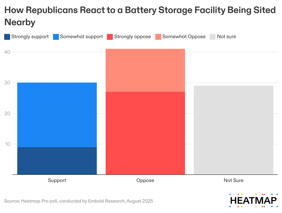 Indeed, Heatmap Pro’s August poll of 3,741 registered voters found that there are now three times as many strong opponents of battery storage facilities among Republicans than strong supporters.