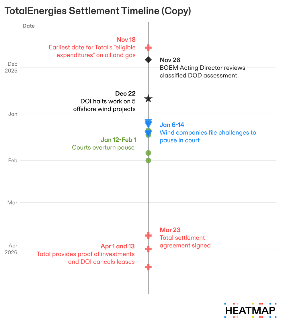 The opening section of the settlement tells a story about the circumstances that led to this unusual deal. The Department of Defense had “raised classified national security concerns” about the leases, it says, referring to the classified reports that Interior Secretary Doug Burgum cited when he halted five offshore wind projects last December. The Interior Department “would have” suspended TotalEnergies’ leases indefinitely, too, the settlement says, “similar to” that December suspension order on the five wind projects. Had the agency done that, however, Total “would have claimed breach of contract” and filed a lawsuit in the U.S. Court of Federal Claims. The agency determined that canceling the lease, instead, was “in the public interest.”