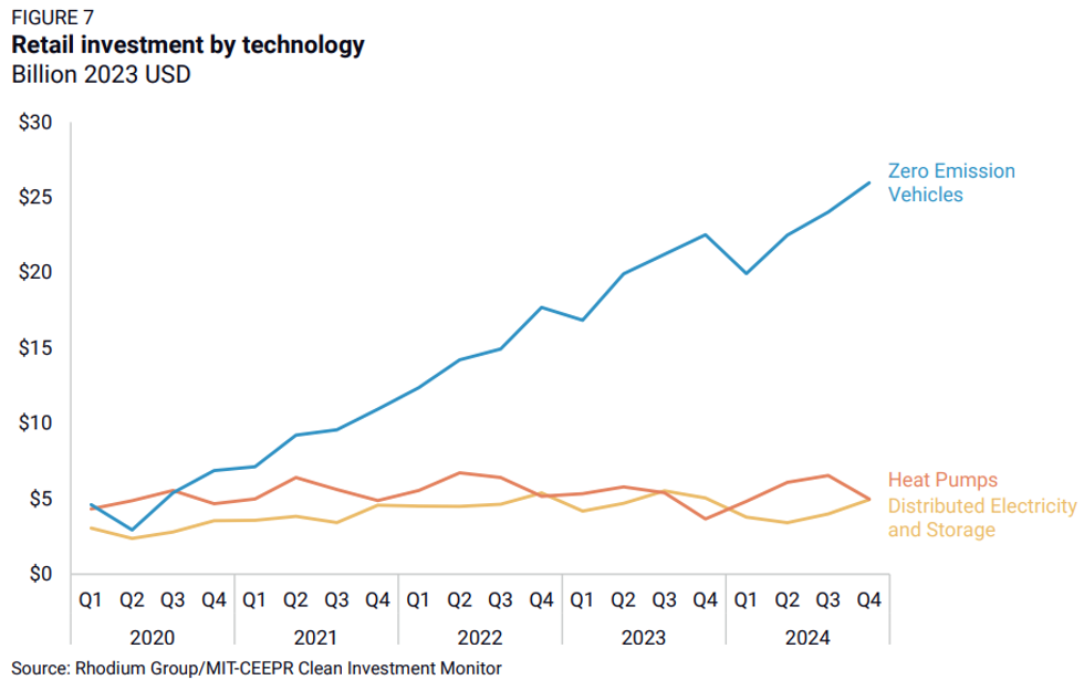 Investment in clean energy and transportation reached $272 billion in the U.S. last year, which is a 16% rise on the previous year, according to Rhodium Group’s Q4 analysis. The “primary drivers of investment” were consumers who were buying clean technologies like EVs, heat pumps, and renewable electricity and storage solutions. Here is a look at those “retail” trends over the last four years: