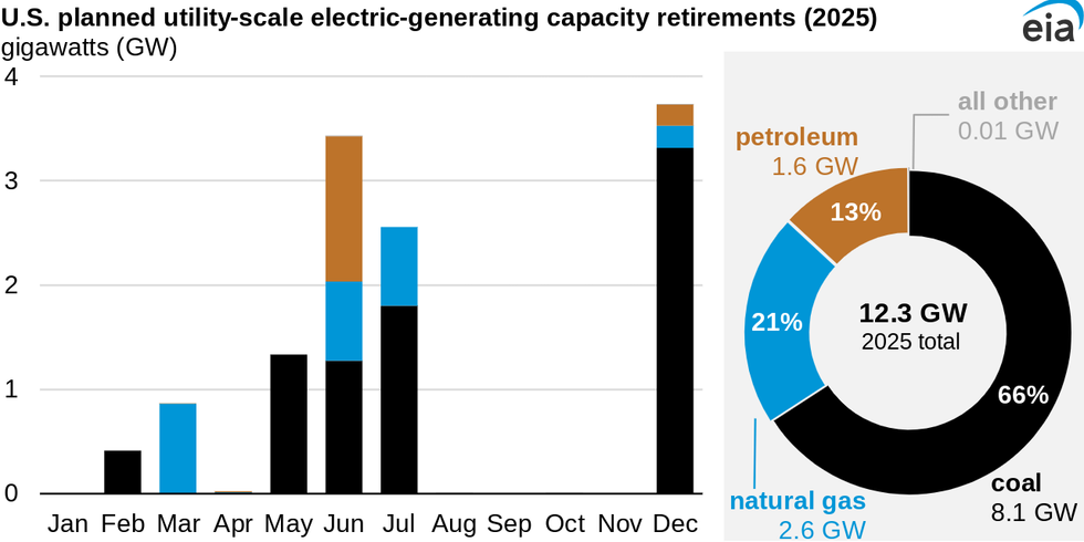 Power generators in the U.S. plan to retire 8.1 gigawatts of coal-fired capacity this year, according to the Energy Information Administration. That’s more than double the 4 GW retired last year but less than the 9.8 GW that have been taken offline each year over the last decade. Planned retirements across all sources for 2025 total about 12.3 GW, and coal power retirements account for the largest share at 66%, followed by natural gas at 21%. At the same time, the EIA expects 63 GW of new utility-scale power capacity to come online this year, 81% of which will be solar and battery storage.