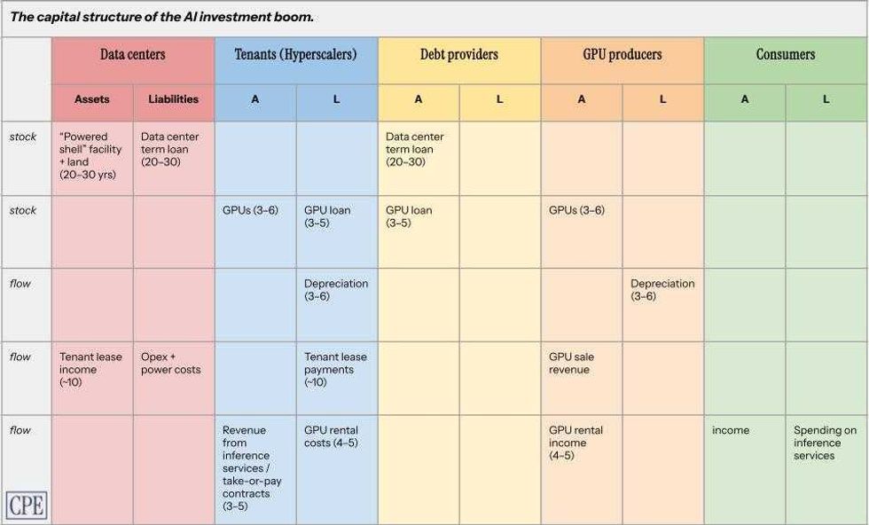 Lenders are the final piece of the puzzle. Contrary to the notion that cash-rich hyperscalers can finance their own data center buildout, there has been a record volume of debt issuance this year from companies such as Oracle and CoreWeave, as well as private credit giants like Blue Owl and Apollo, which are lending into the boom. The debt may not go directly onto hyperscalers’ balance sheets, but their purchase commitments are the collateral against which data center developers, neocloud companies like CoreWeave, and private credit firms raise capital. While debt is not inherently something to shy away from ― it’s how infrastructure gets built ― it’s worth raising eyebrows at the role private credit firms are playing at the center of this revenue-free investment boom. They are exposed to GPU financing and to data center financing, although not the GPU producers themselves. They have capped upside and unlimited downside. If they stop lending, the rest of the sector’s risks look a lot more risky.